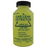 Our low temperature gas leak detector comes in an 8 ounce bottle with a brush. The leaks appear as large strong bubbles which cling to the surface and are fluorescent under a black light. The leak detector solution is non-freezing, non-toxic, fluorescent, Rated to -30 degrees F (-34 degree C), andhas a Bubble-type gas leak detector.It can be used on hot and cold piping, air, Natural Gas, all Refrigerants, and most gases.