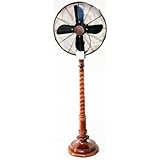 For long-lasting beauty with retro styling, this 16-inch floor-standing fan features durable wood and polyresin construction, a neck resembling a twisted baguette, and an elegantly detailed round-shaped base. The unit provides a whisper-quiet 45-watt motor and four fan blades for cooling relief in the summer or effective air circulation all year long. Choose from three different speed settings, low at 900 RPM, medium at 1100 RPM, or high at 1280 RPM. In addition, the fan's horizontal oscillation of 135 degrees keeps air moving throughout the room, plus it can be tilted vertically by up to 10 degrees to ensure the proper angle. Other highlights include a traditional round shape, a user-friendly control knob, simple assembly, and an easy-to-clean design. Ideal for the living room, office, or bedroom, the floor-standing fan measures approximately 12 by 17 by 54 inches and carries a one-year limited warranty.